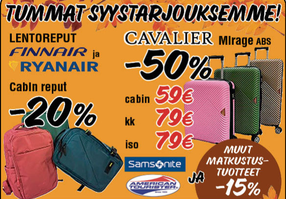 Valikoimasta löydät lentolaukut, keskikokoiset ja isot laukut tunnetuilta merkeiltä, kuten Samsonite ja Cavalier.