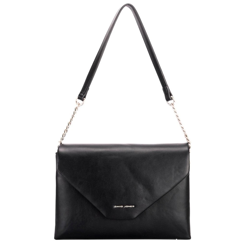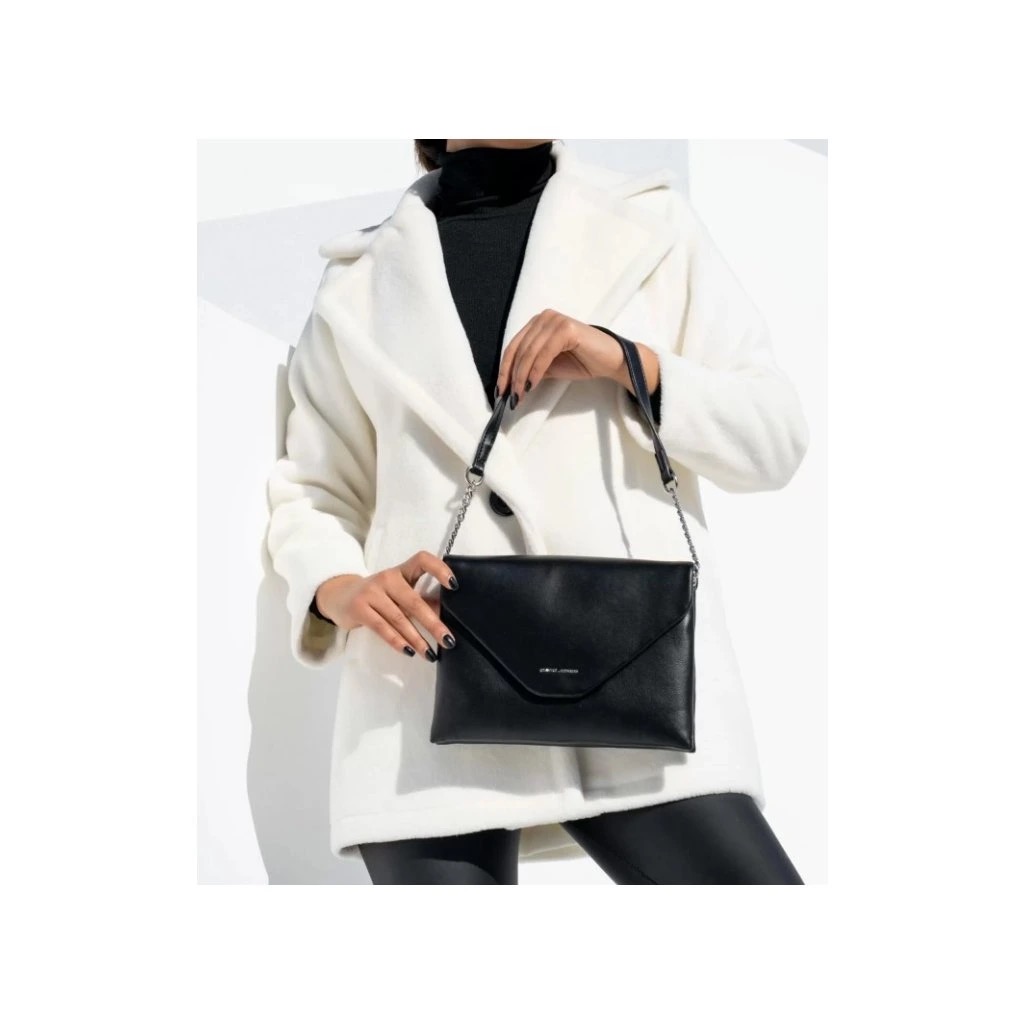 Tyylikäs ja monikäyttöinen olkalaukku musta. Laukussa on klassinen kirjekuorimallinen läppä ja olkahihnassa elegantit hopeanväriset ketjusomisteet.
