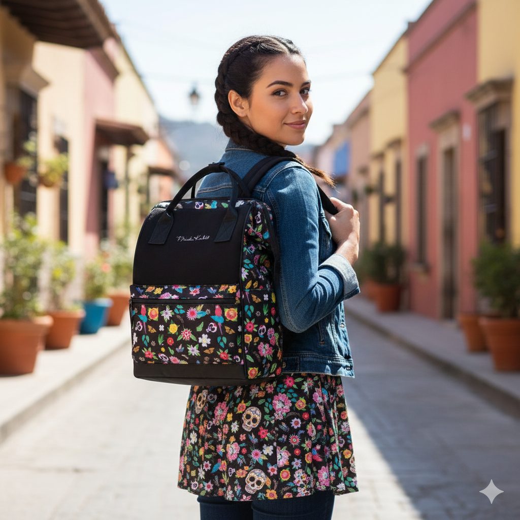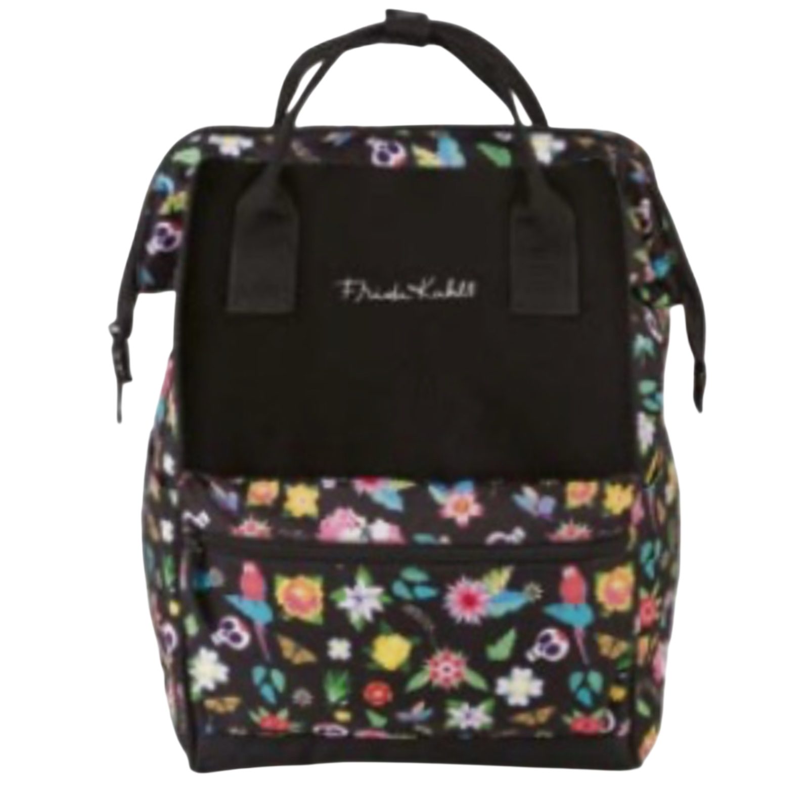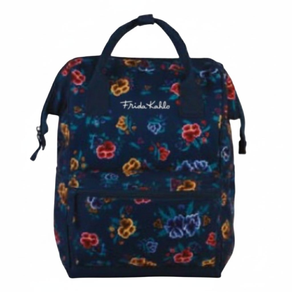 Tämä leveä aukko reppu yhdistää näyttävän Frida Kahlo -designin ja käytännöllisen rakenteen. Mustan ja sinisen sävyinen reppu on koristeltu kauniilla kukkakuviolla, joka tuo persoonallisuutta arkeen.