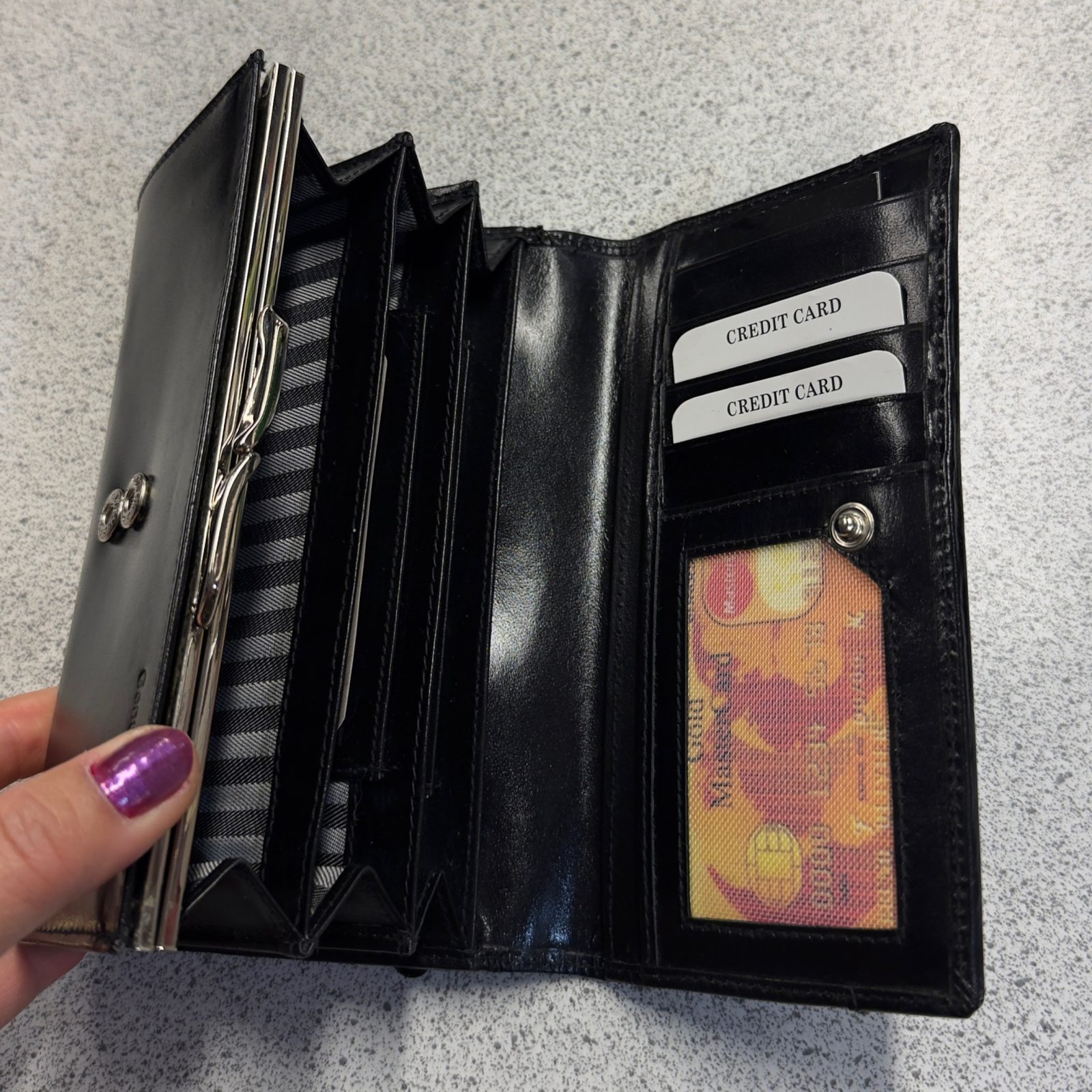 - Lompakko aukeaa haitarimaisesti ja tarjoaa erilliset lokerot seteleille ja kuiteille sekä 8 korttitaskua.