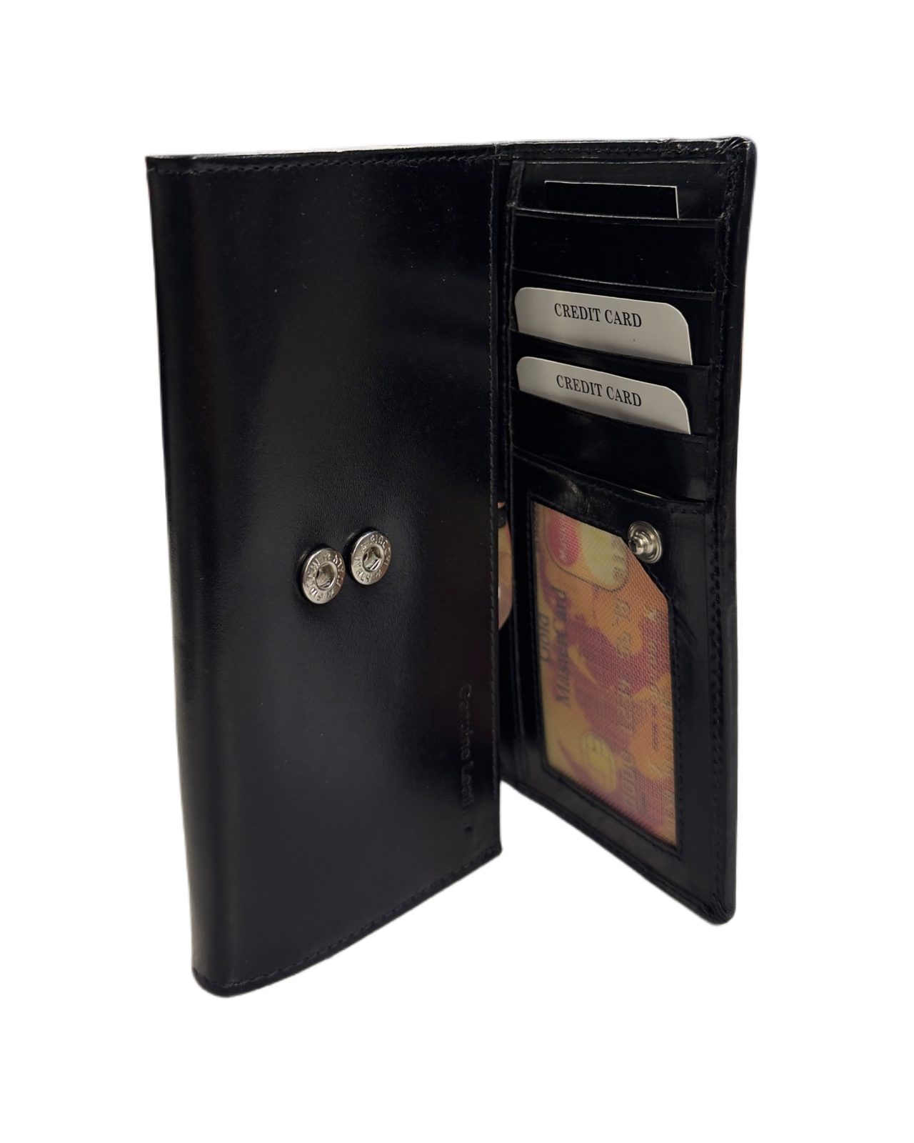 Tyylikäs ja tilava nahkalompakko, jossa on kehys ja kahden nepparin kiinnitys, yhdistää perinteisen muotoilun ja erinomaisen käytännöllisyyden.