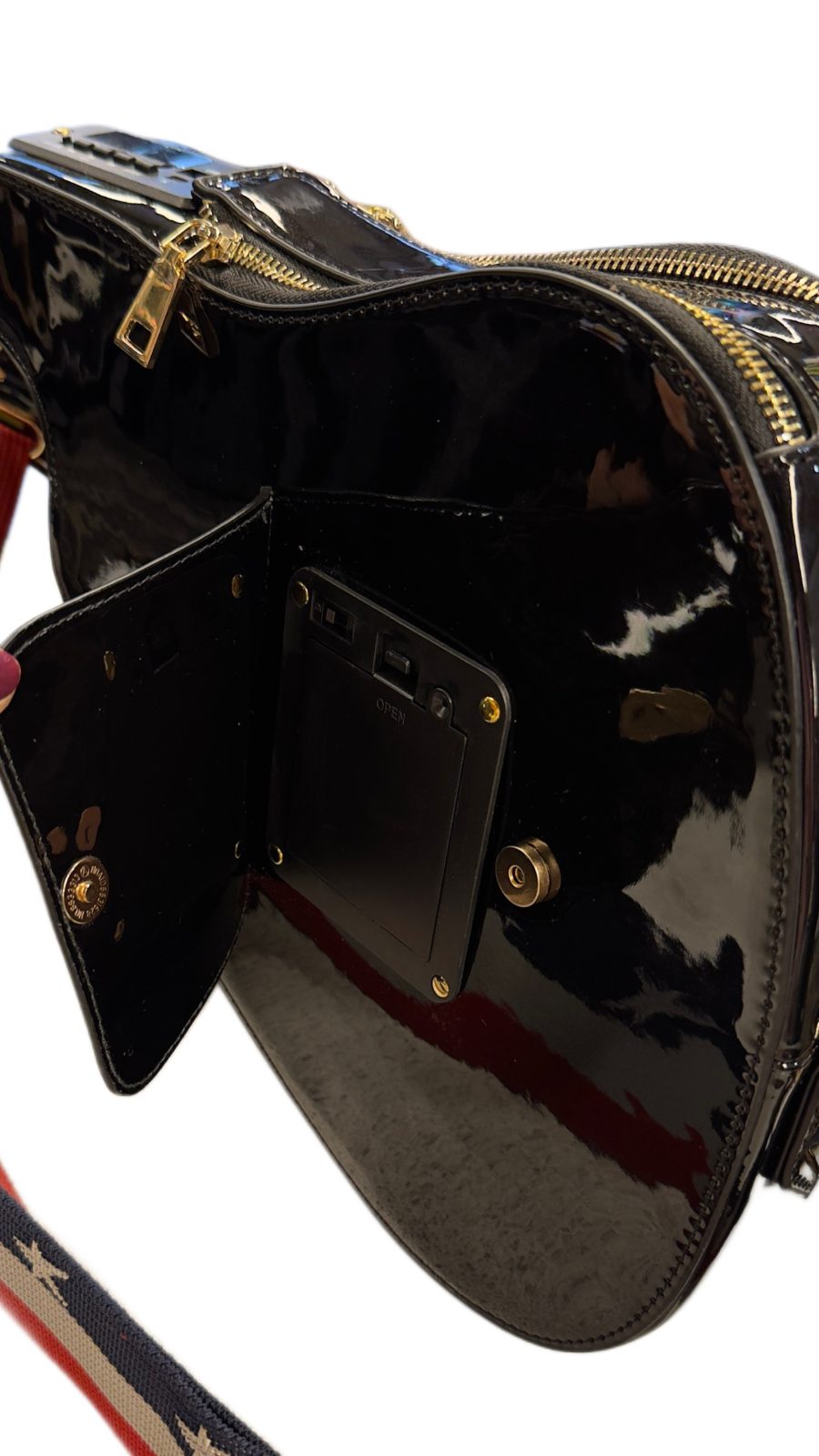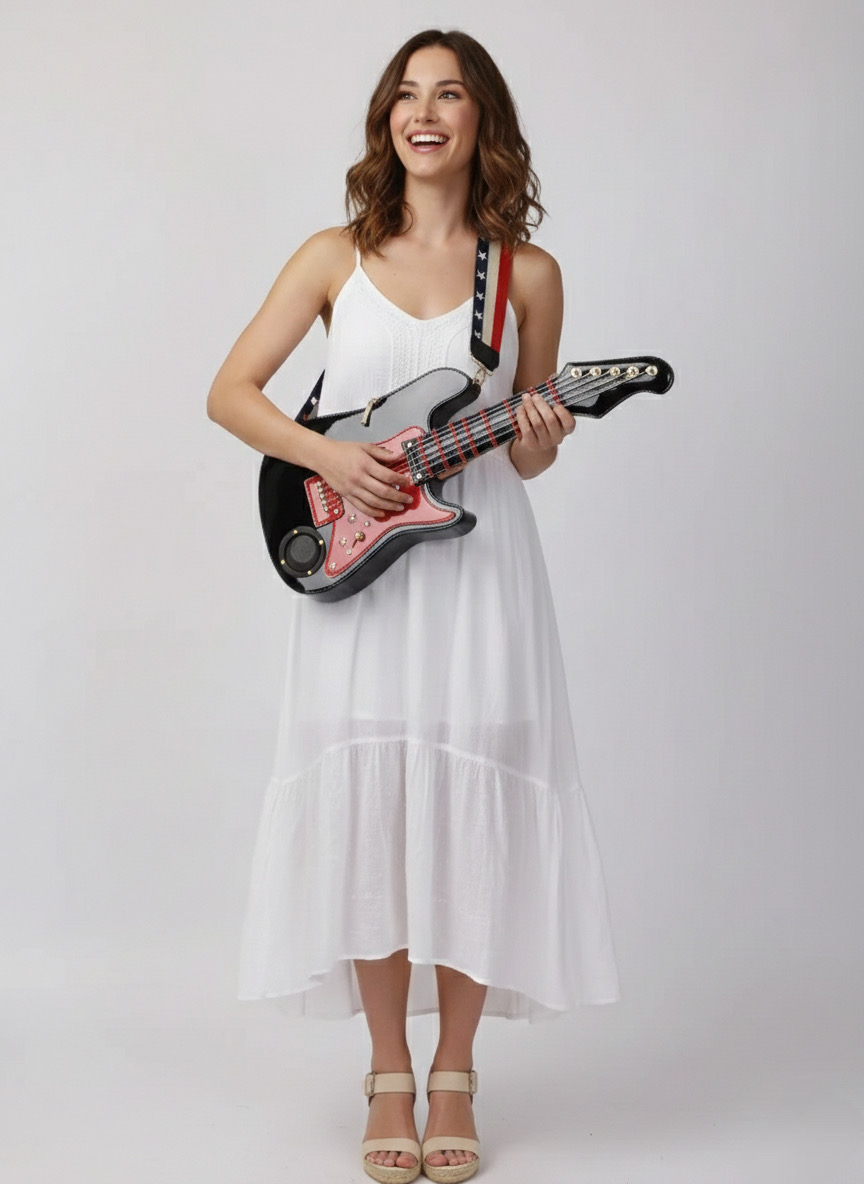 Haluatko erottua joukosta ja kääntää katseet kaupungilla, festareilla tai juhlissa? Tämä ei ole vain laukku, vaan todellinen showstopper! Upea, kiiltäväpintainen kitaralaukku yhdistää rock-henkisen muodin ja kannettavan äänentoiston ennennäkemättömällä tavalla.