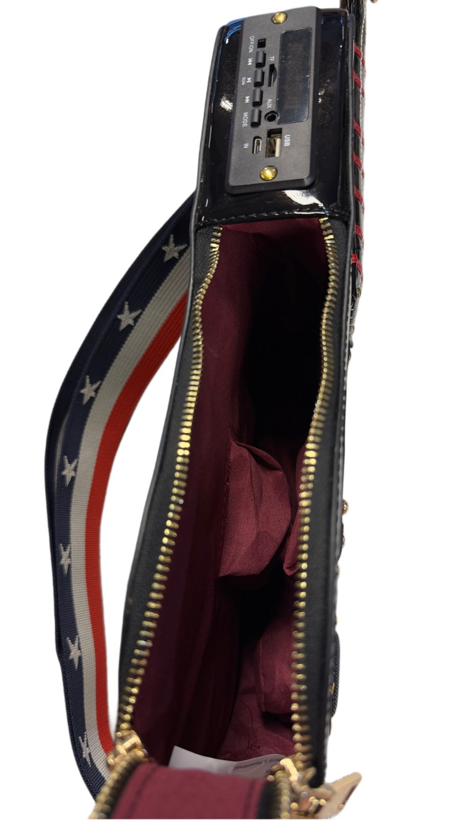 Laukku ei ainoastaan näytä hyvältä, vaan se on myös täysin toimiva Bluetooth-kaiutin ja radio. Soita lempimusiikkiasi suoraan laukusta ja ole oman elämäsi rock-tähti missä tahansa liikutkin.