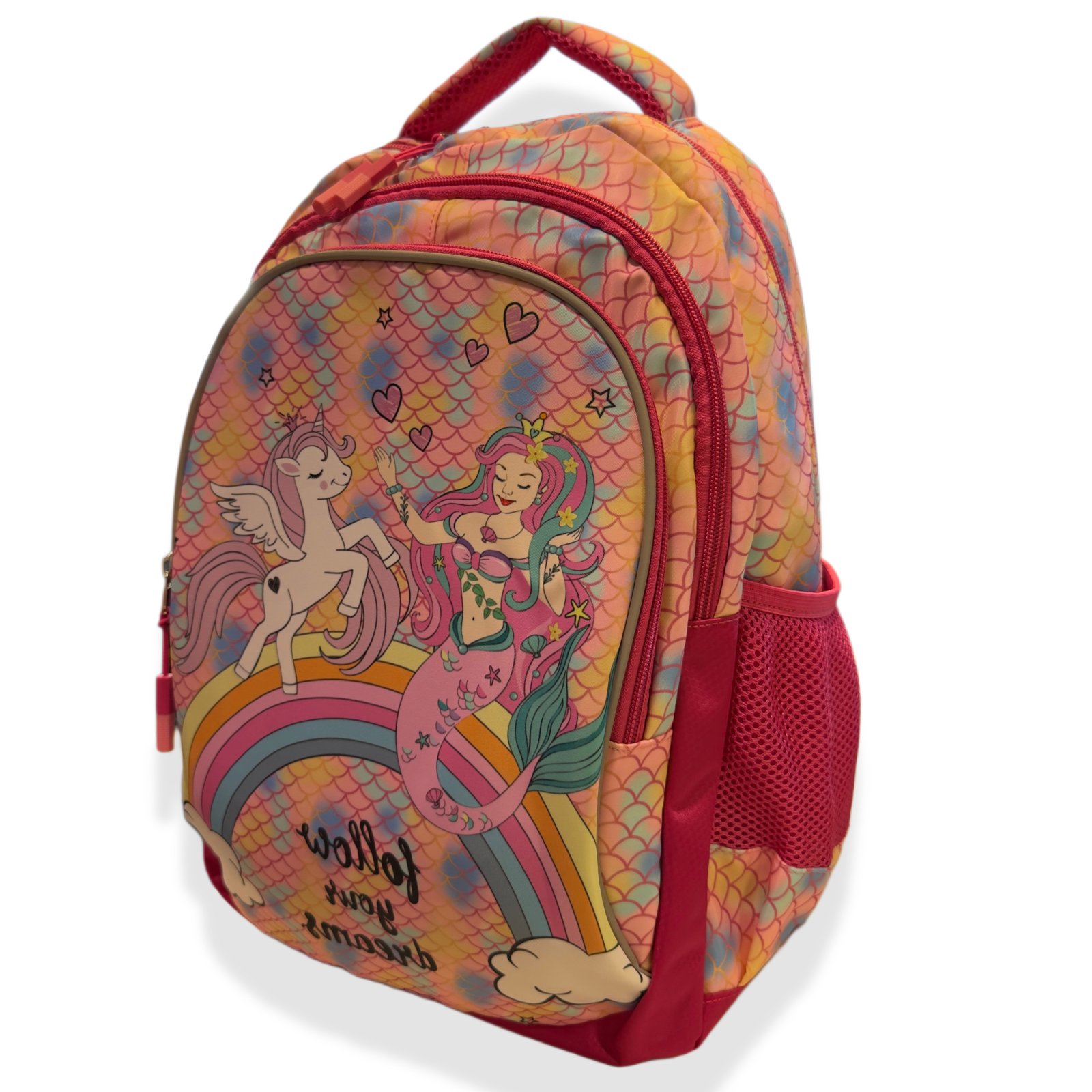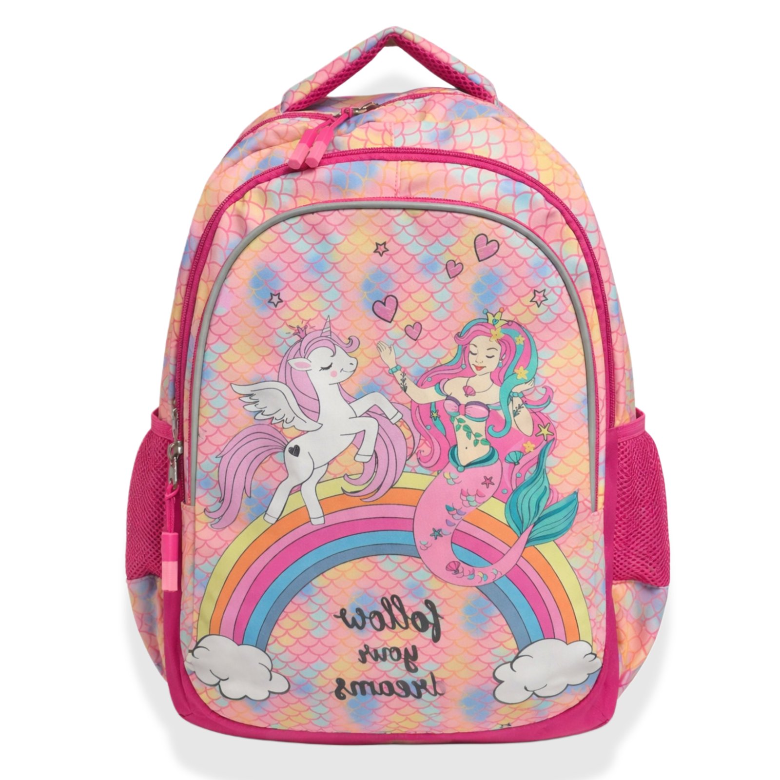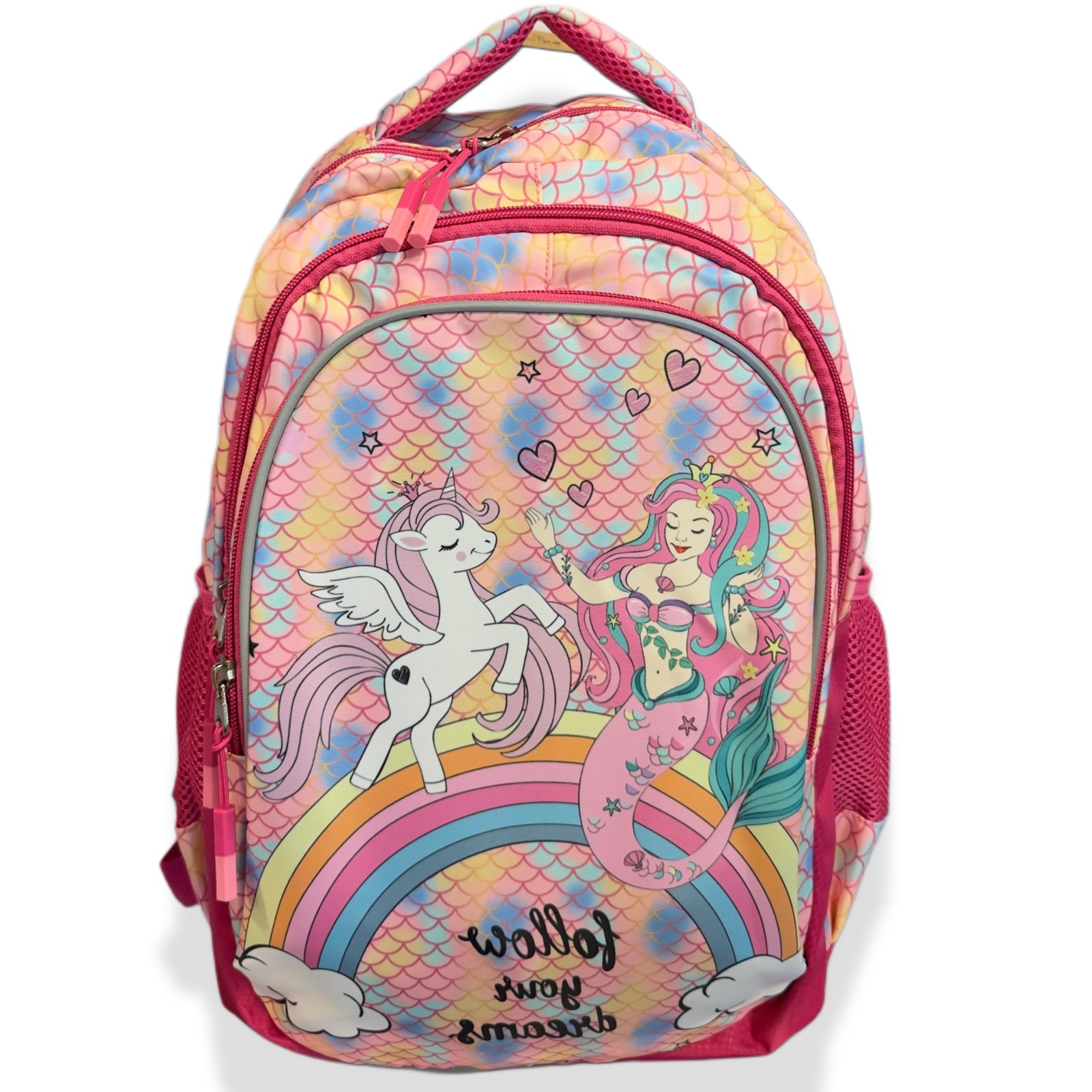 Suloinen vaaleanpunainen lasten reppu, jossa ihastuttava yksisarvis- ja merenneitokuosi. Kevyt ja käytännöllinen reppu sopii täydellisesti päiväkotiin, esikouluun tai koulun aloitukseen.