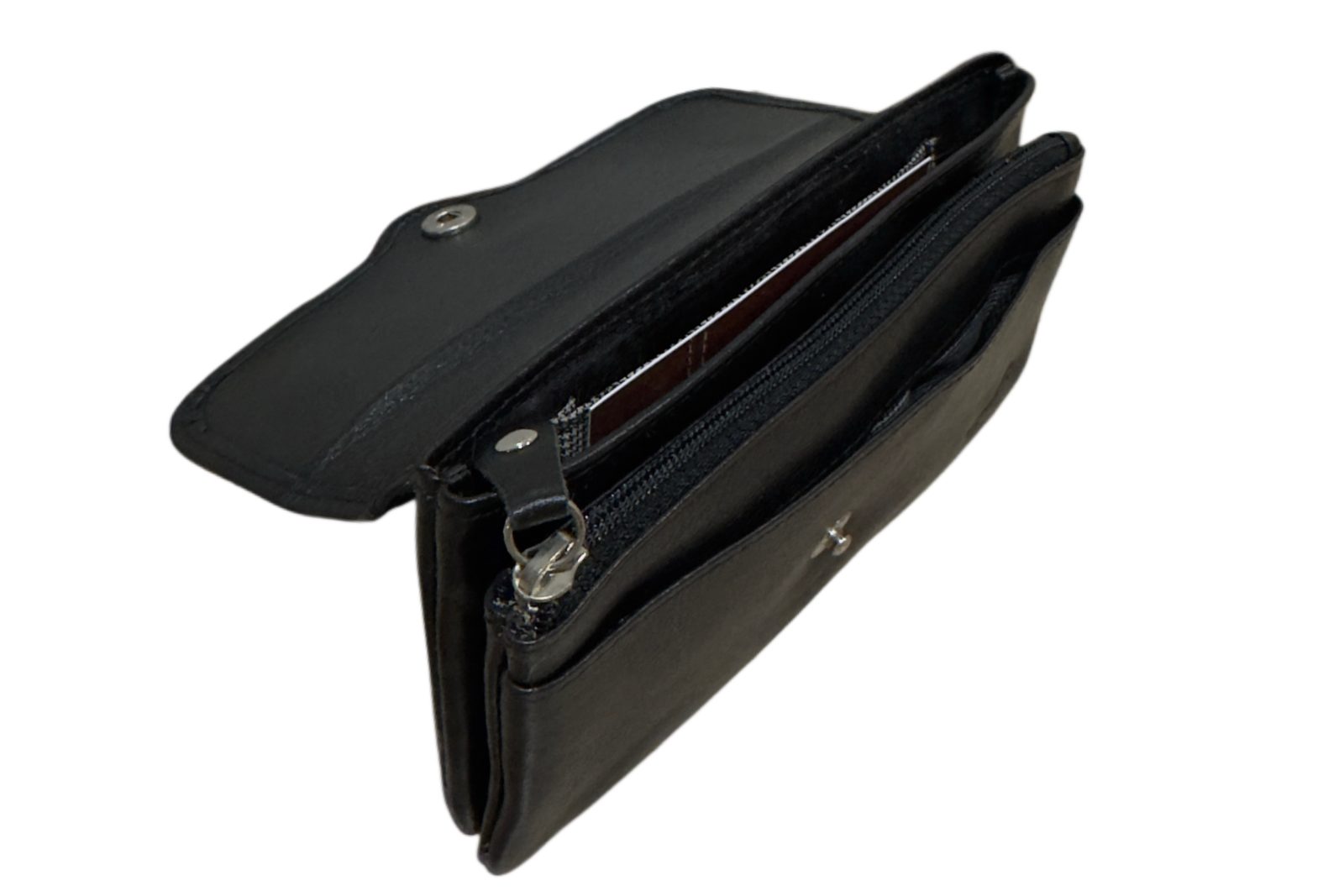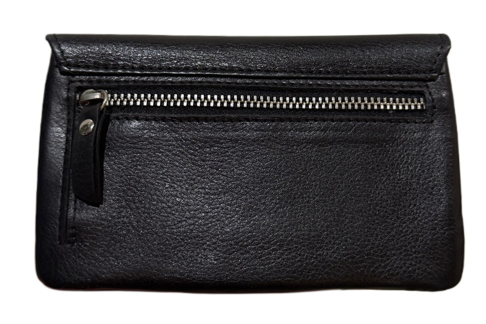 Lompakko sulkeutuu nepparikiinnityksellä ja sisältää useita toimivia säilytysratkaisuja: sisällä on 6 korttipaikkaa, avotaskuja sekä mahdollisesti vetoketjullisia osioita pienille arvoesineille. Takapuolelta löytyy erillinen vetoketjullinen tasku, joka sopii kolikoille tai kuiteille. Hopeanväriset yksityiskohdat viimeistelevät ajattoman ilmeen.