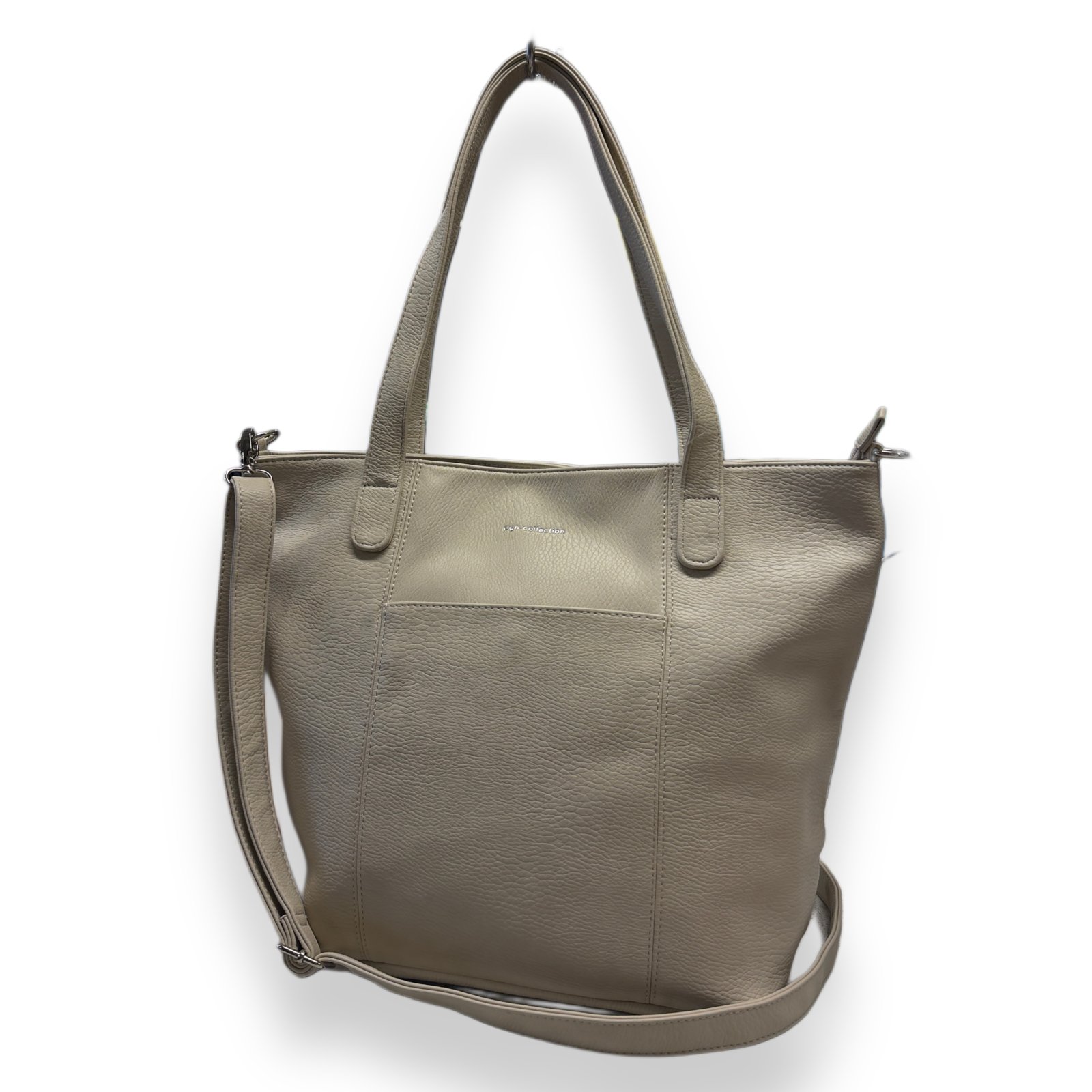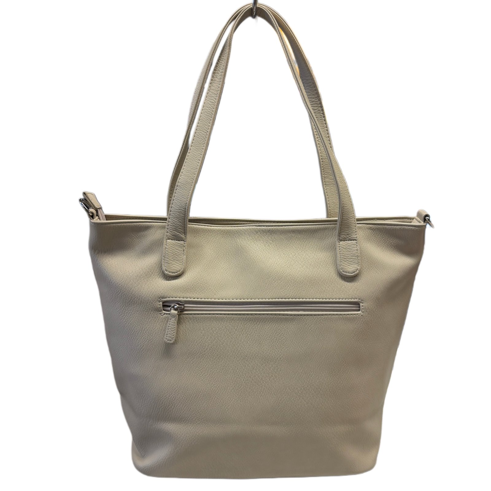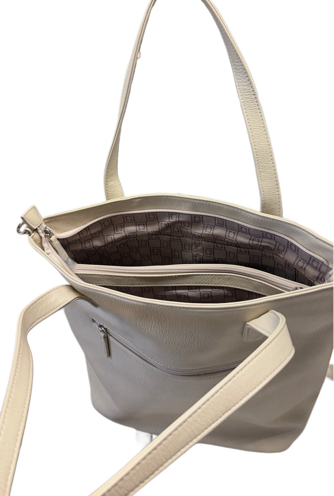 Tilava beige laukku arkeen ja töihin. Lyhyet kantokahvat ja säädettävä olkahihna, useita taskuja sekä vetoketjullinen välitasku helpottavat tavaroiden järjestämistä.