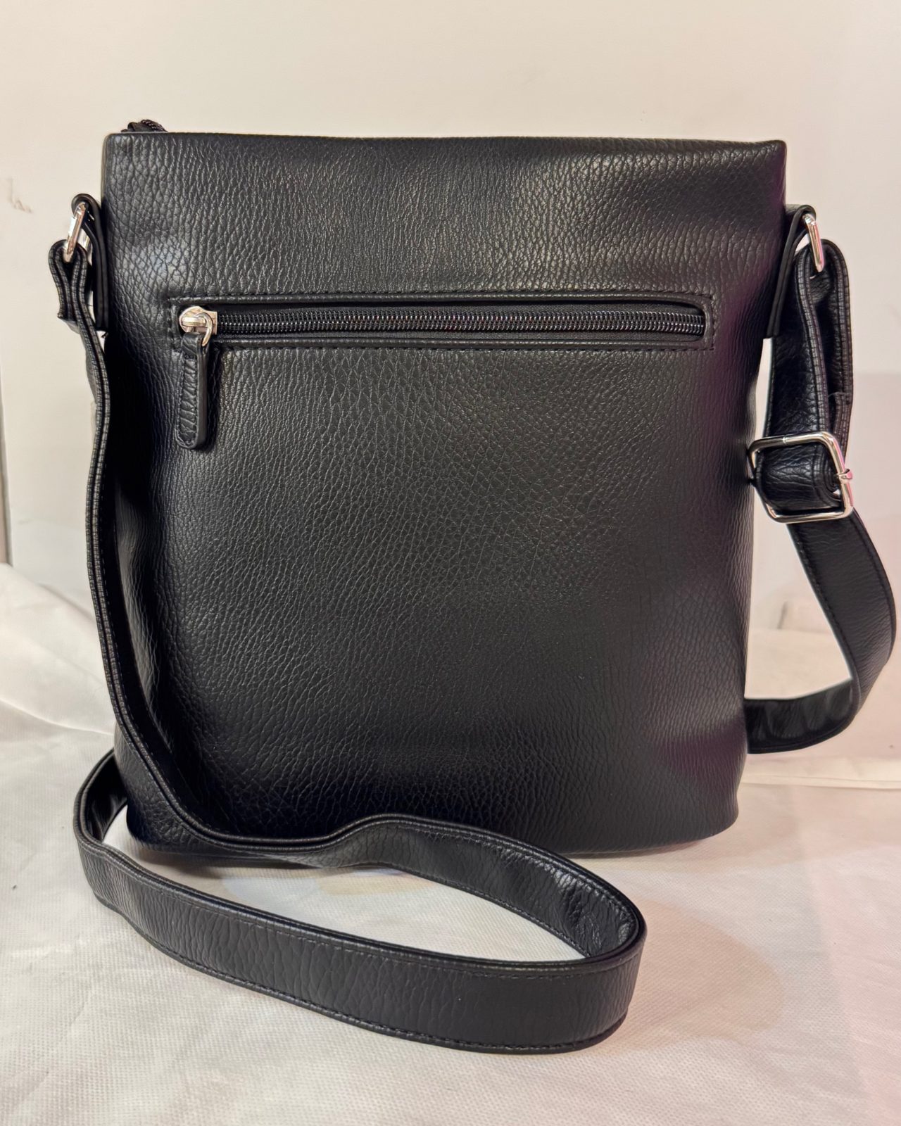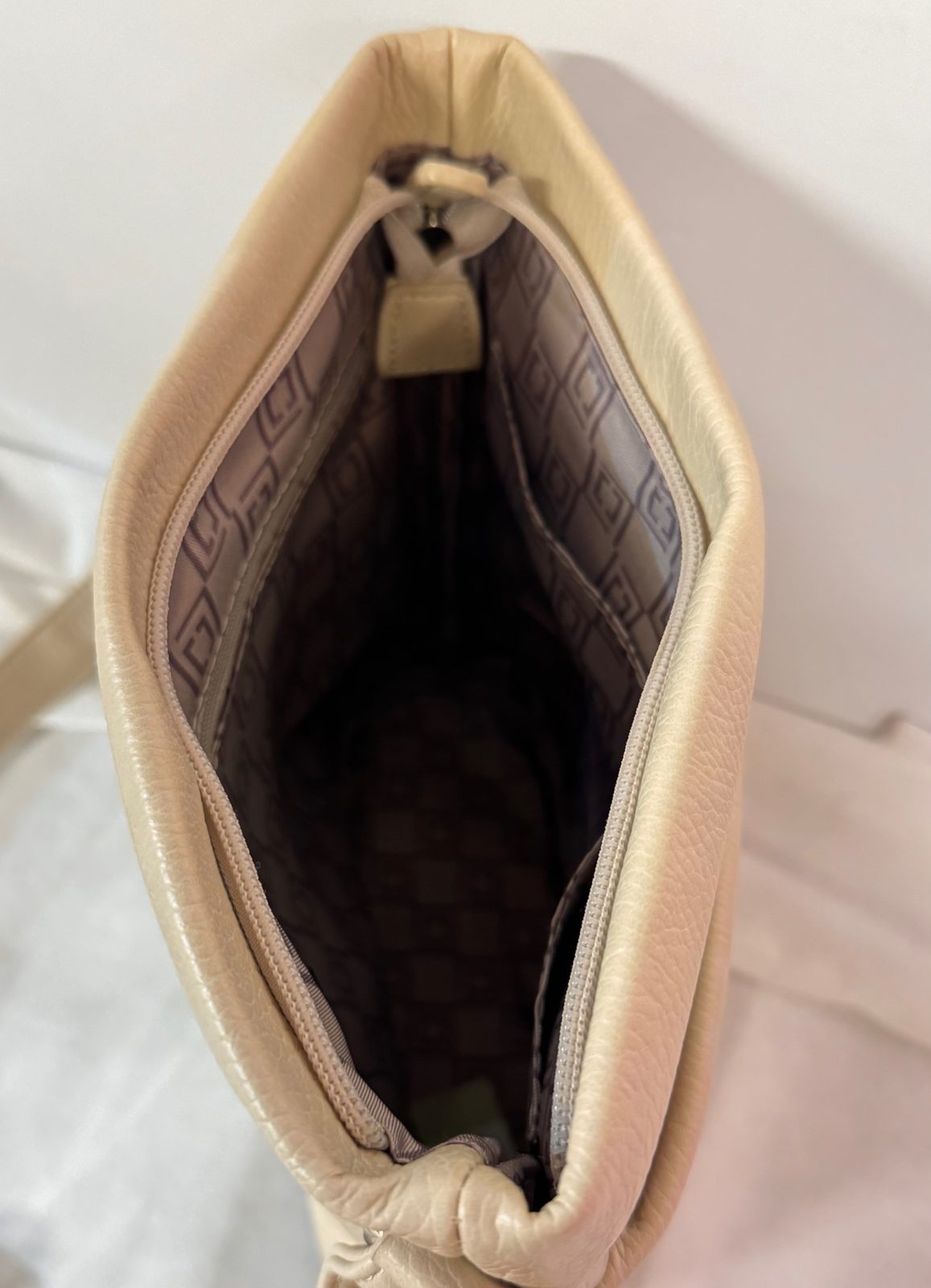Laukku sulkeutuu vetoketjulla, ja sisältä avautuu vaalea vuori, joka helpottaa tavaroiden löytämistä. Sisätiloissa on käytännöllistä avotaskua, vetoketjullinen tasku. Lisäksi laukun takaa löytyy vielä yksi vetoketjullinen tasku ja edessä pienten tavaroiden säilyttämiseen.