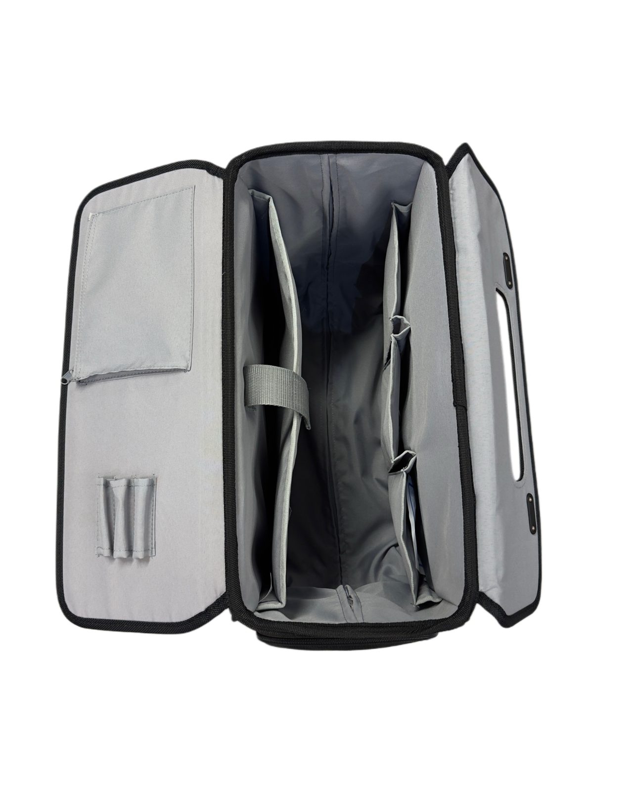 Salkku lukittuu turvallisesti numerolukoilla. Sisäpuolelta löytyy tietokonetasku jopa 17” kannettavalle, kolme avotaskua sekä päädyssä vetoketjutasku ja erilliset avotaskut kynille. Selkeä rakenne auttaa pitämään tavarat järjestyksessä.