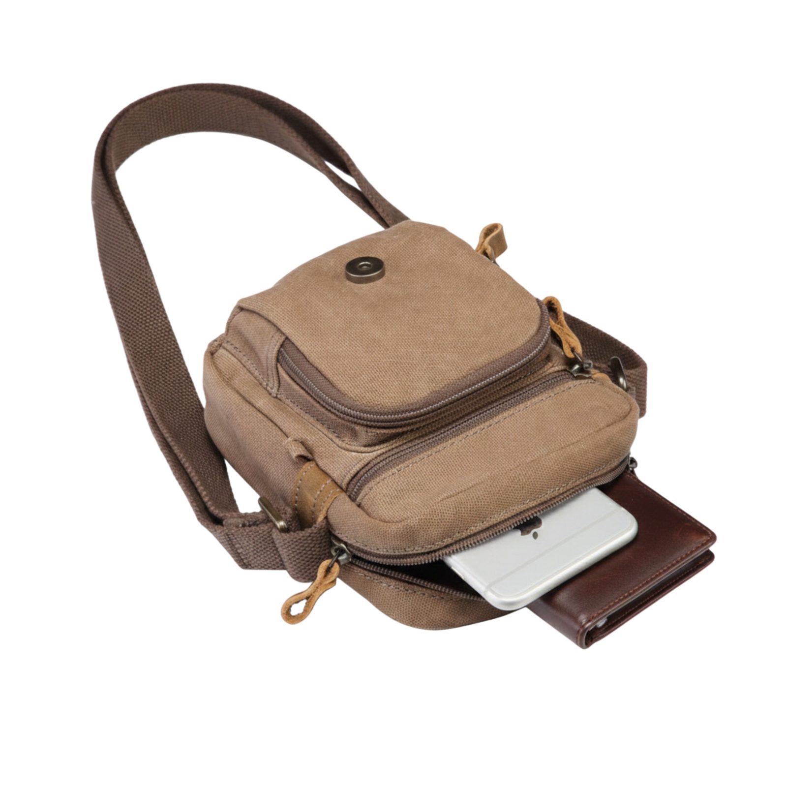 CLASSIC canvas pieni crossbody laukku on pienikokoinen laukku, jossa on yksi päätasku. Sen sisällä on avoin tasku puhelimelle sekä vetoketjullinen sisätasku, ja lisäksi laukussa on pieni etutasku. Tämä kompaktin kokoinen canvas-crossbody-laukku on täydellinen matkailijalle – siihen mahtuvat passi, lompakko ja pienet elektroniset laitteet.